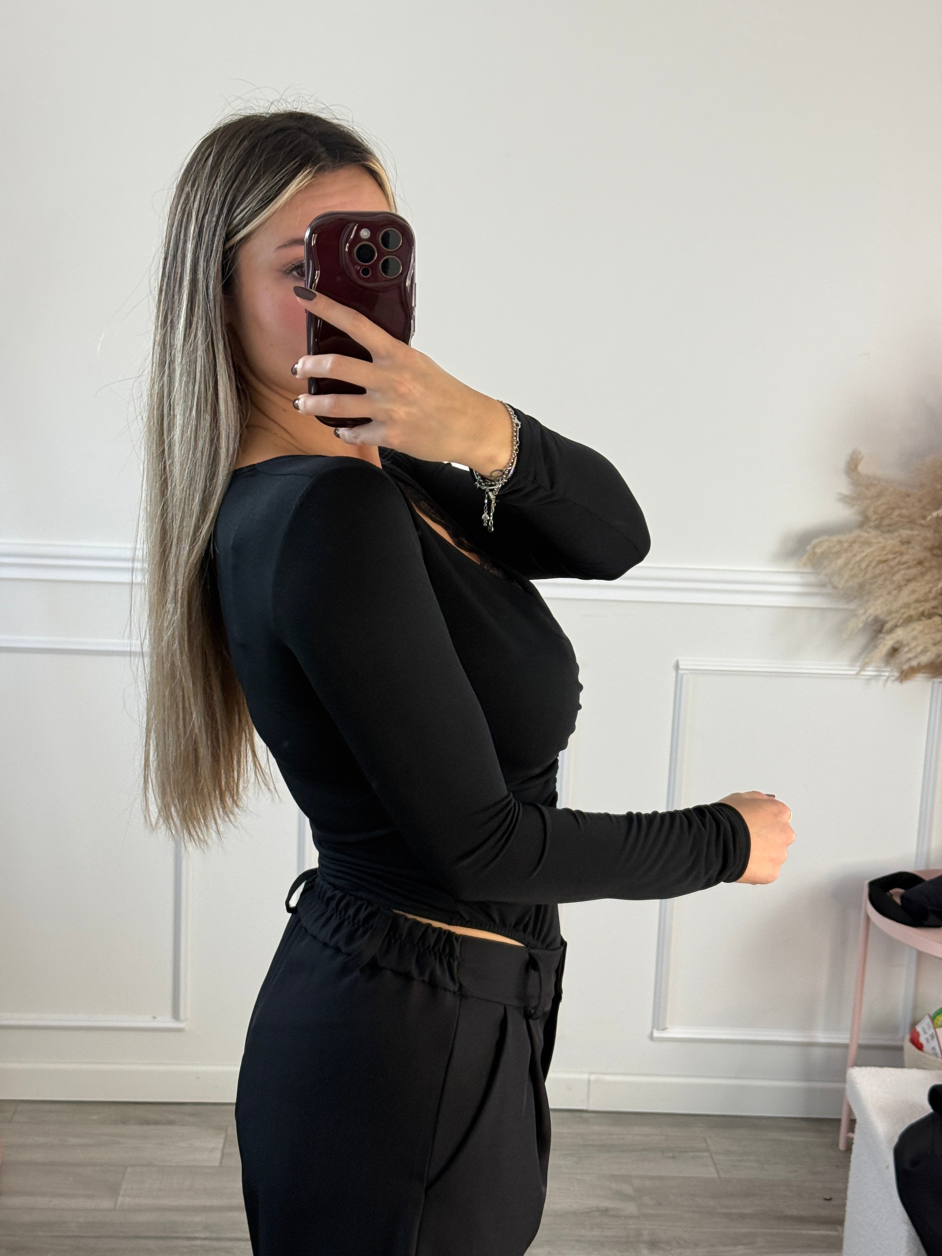 Body drappeggiato con scollo a V e ricami in pizzo.