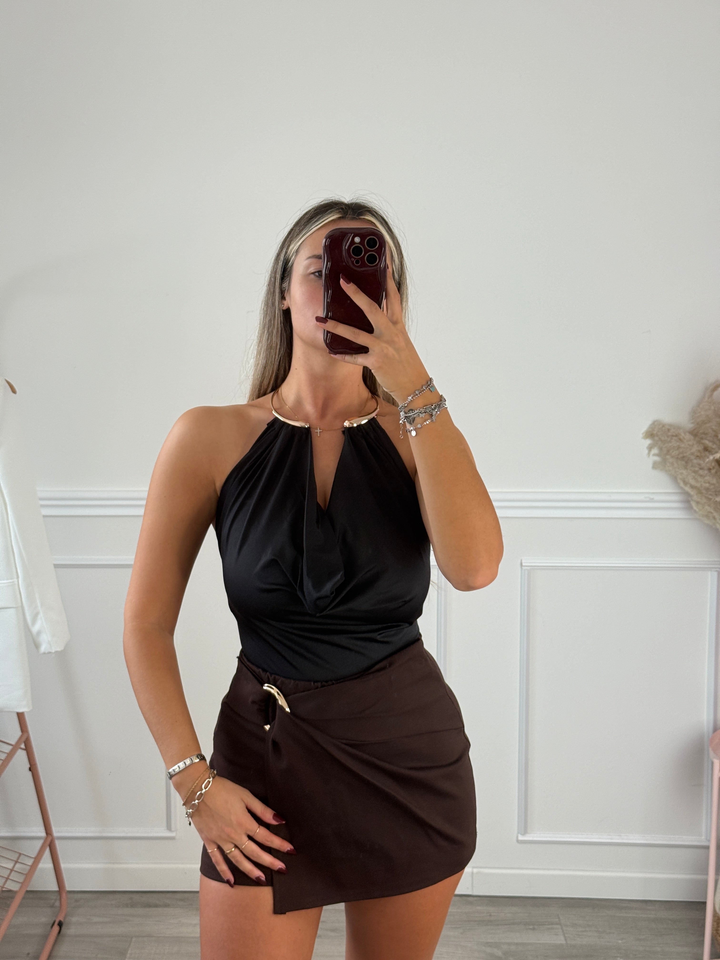 Body in raso con collo halter con collare dorato rigido.