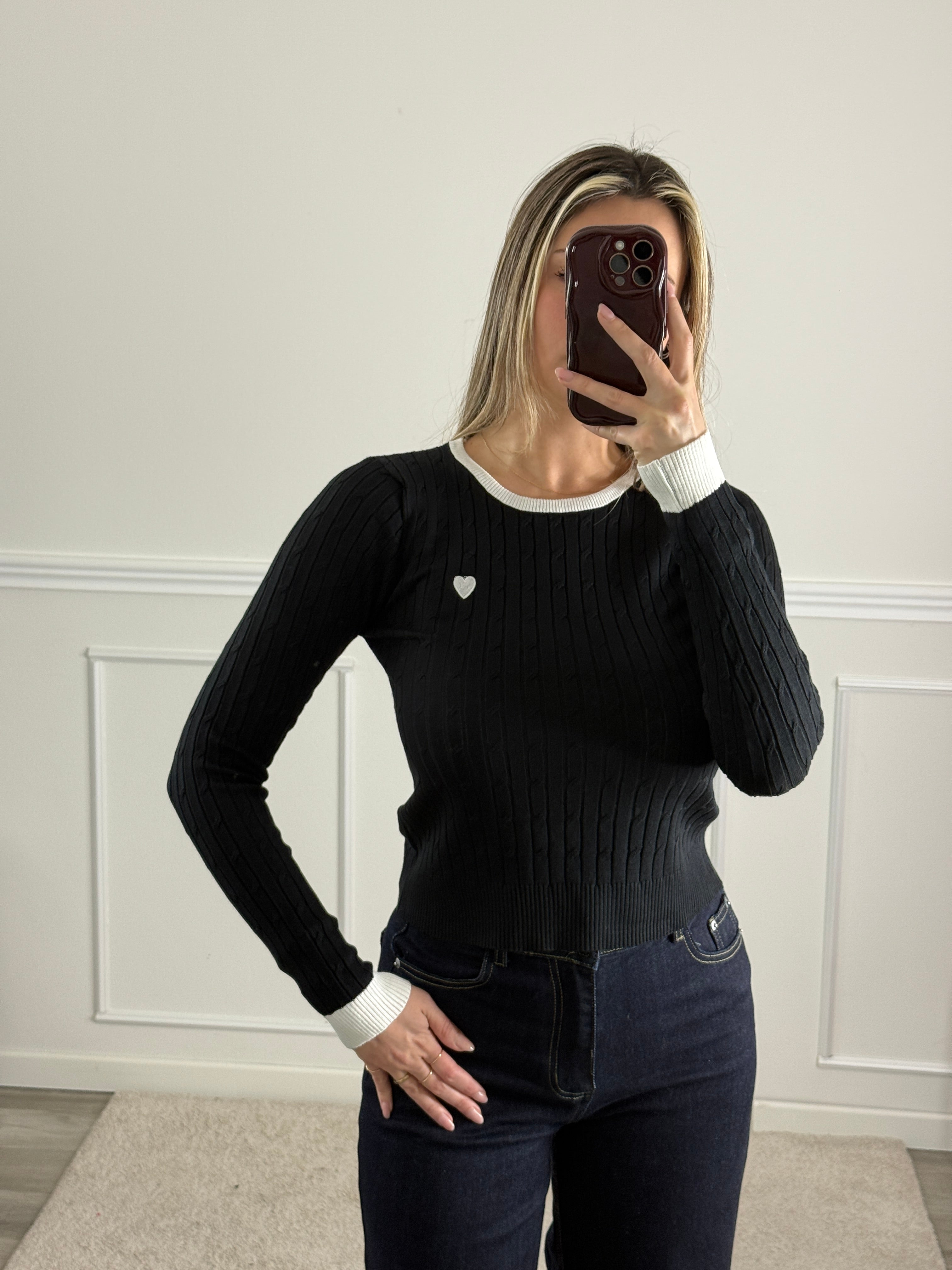 Gli orli a contrasto rendono questo maglioncino speciale! Il cuore ricamato è delicato e femminile. Lo indosso praticamente sempre!