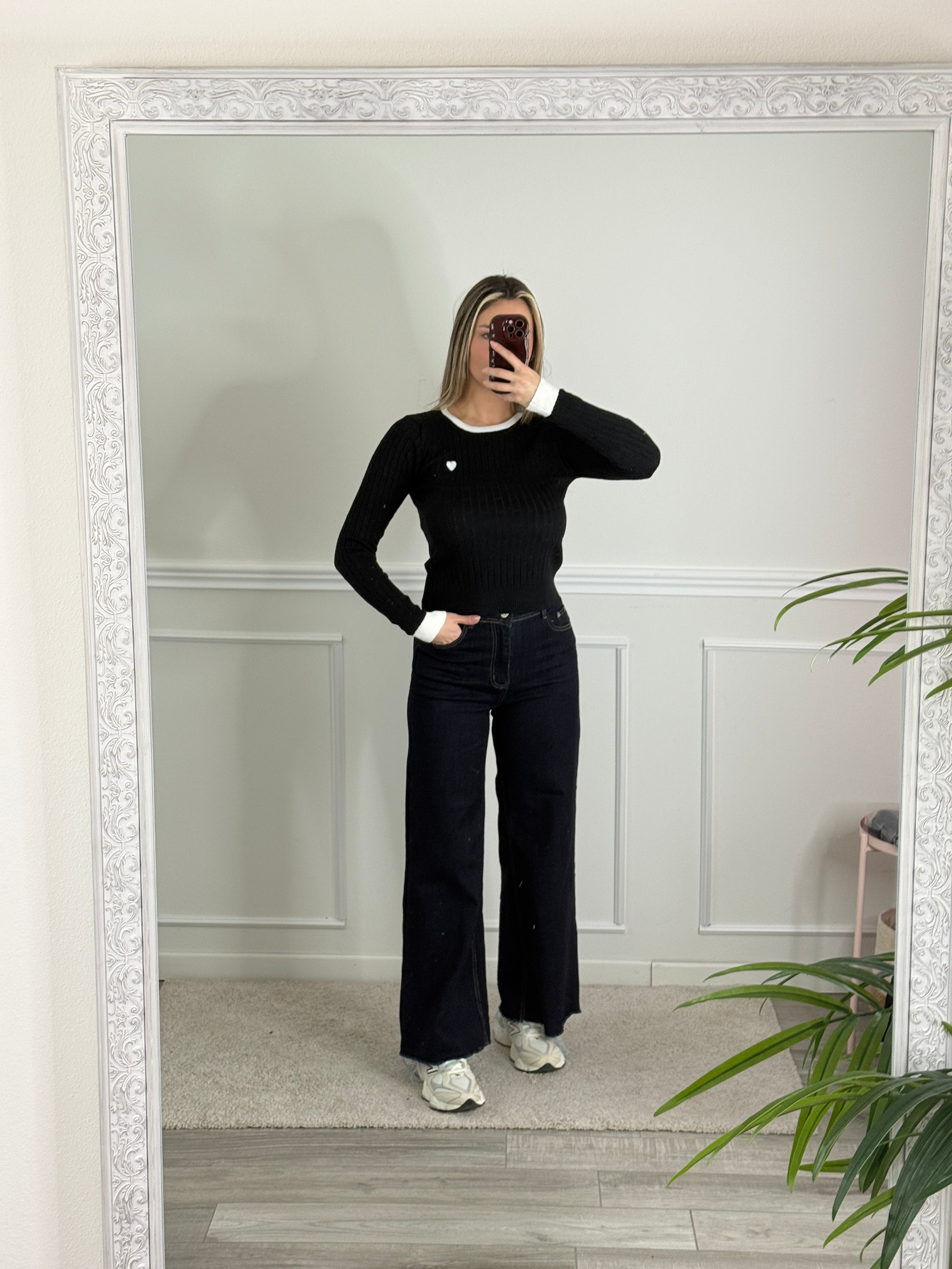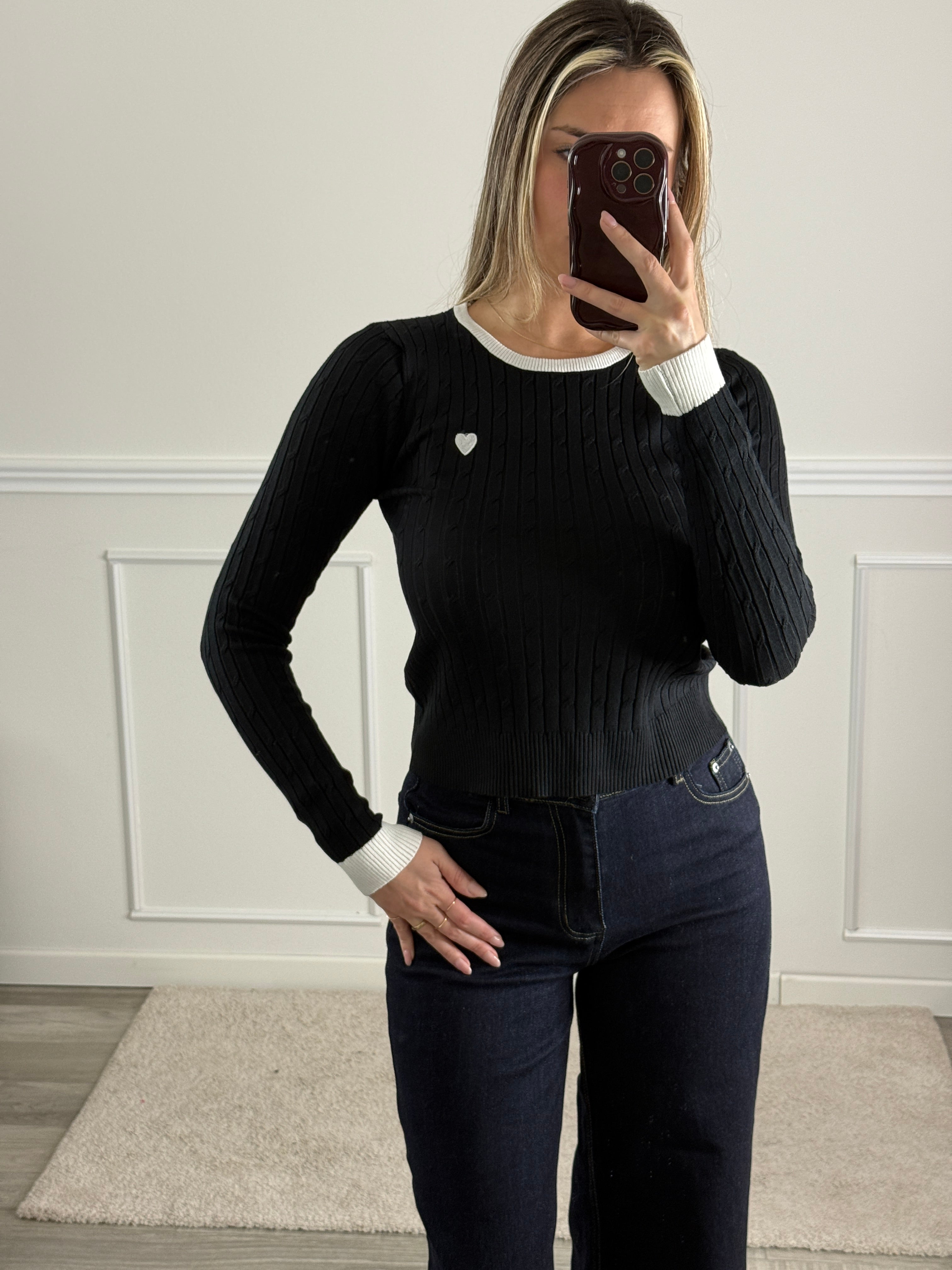 Maglioncino girocollo con orli a contrasto e cuore ricamato.