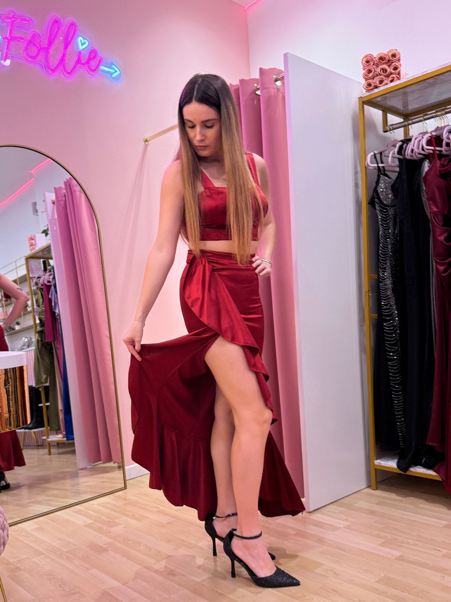 Set top e gonna lunga in raso con volant.