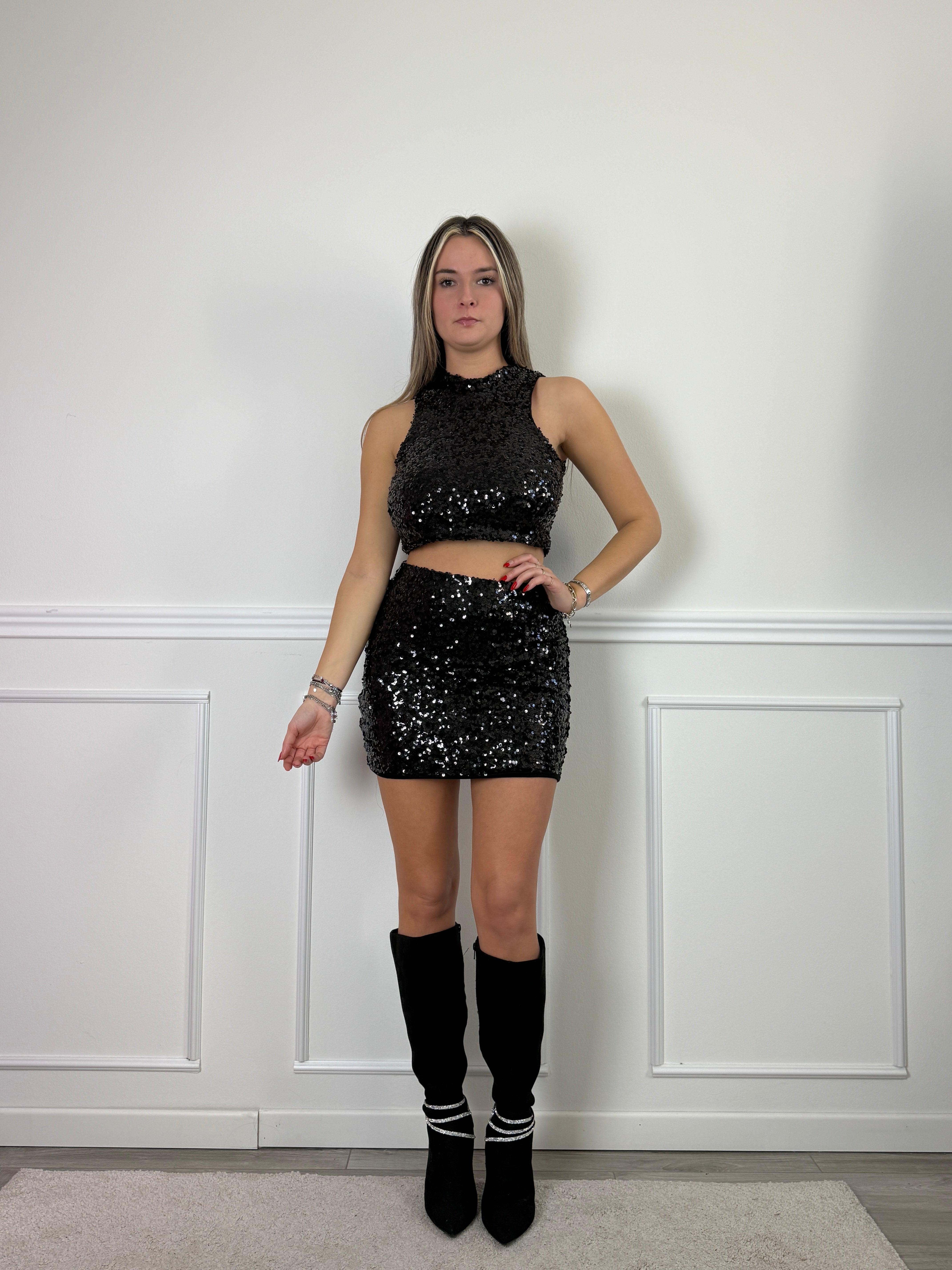 Top corto smanicato con paillettes.