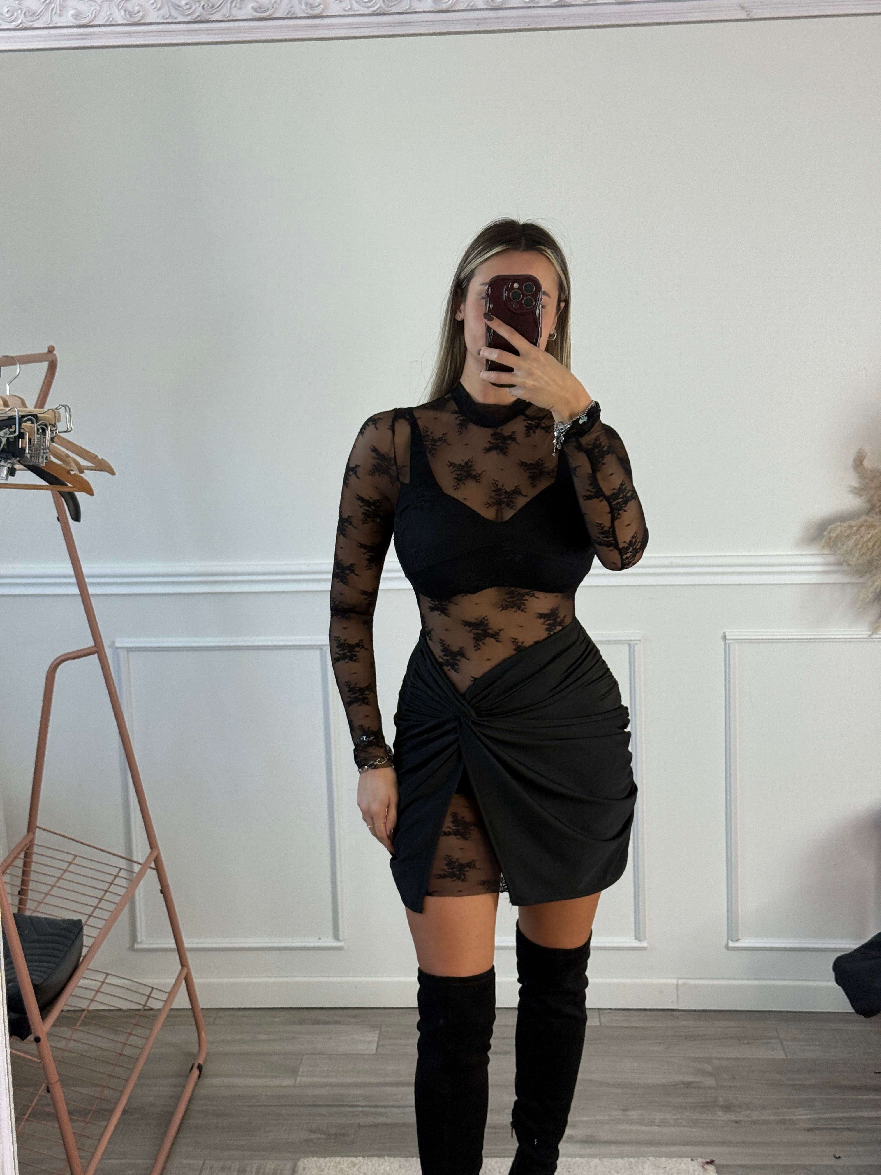 Vestitino velato con ricami in pizzo e gonna drappeggiata asimmetrica.