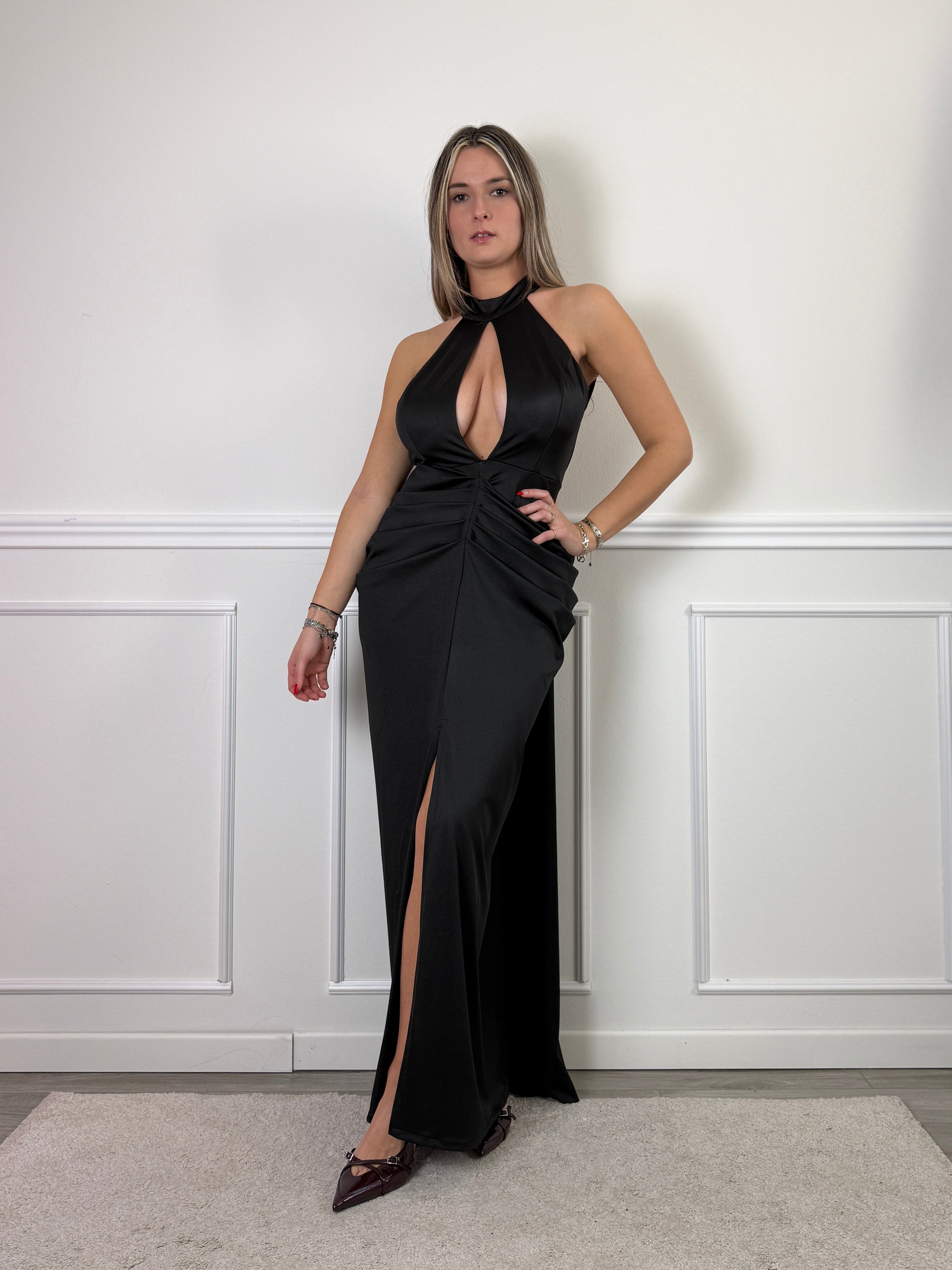 Vestito lungo in raso con scollo all’americana, scollatura a goccia e drappeggio sui fianchi effetto bombè.